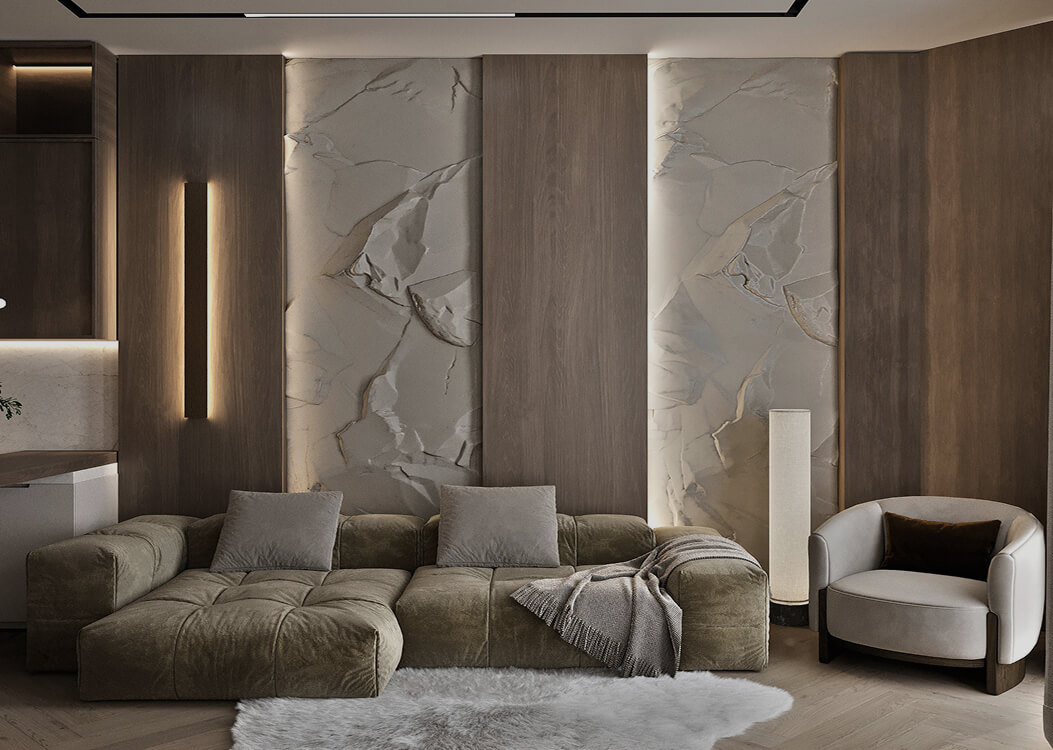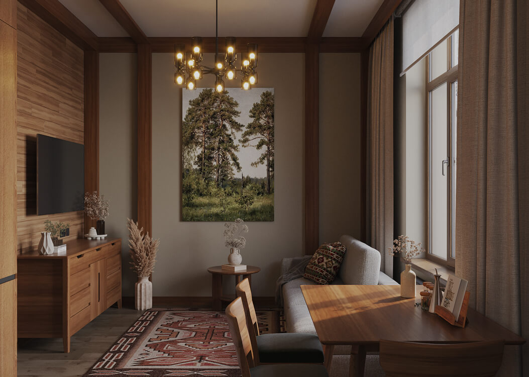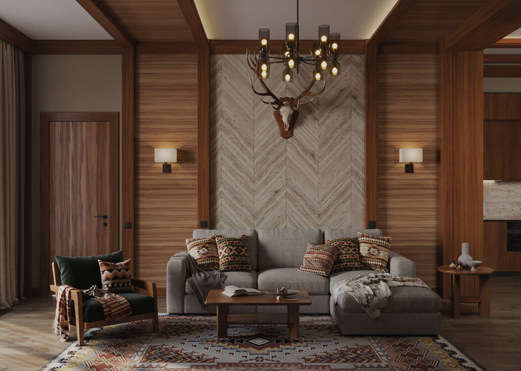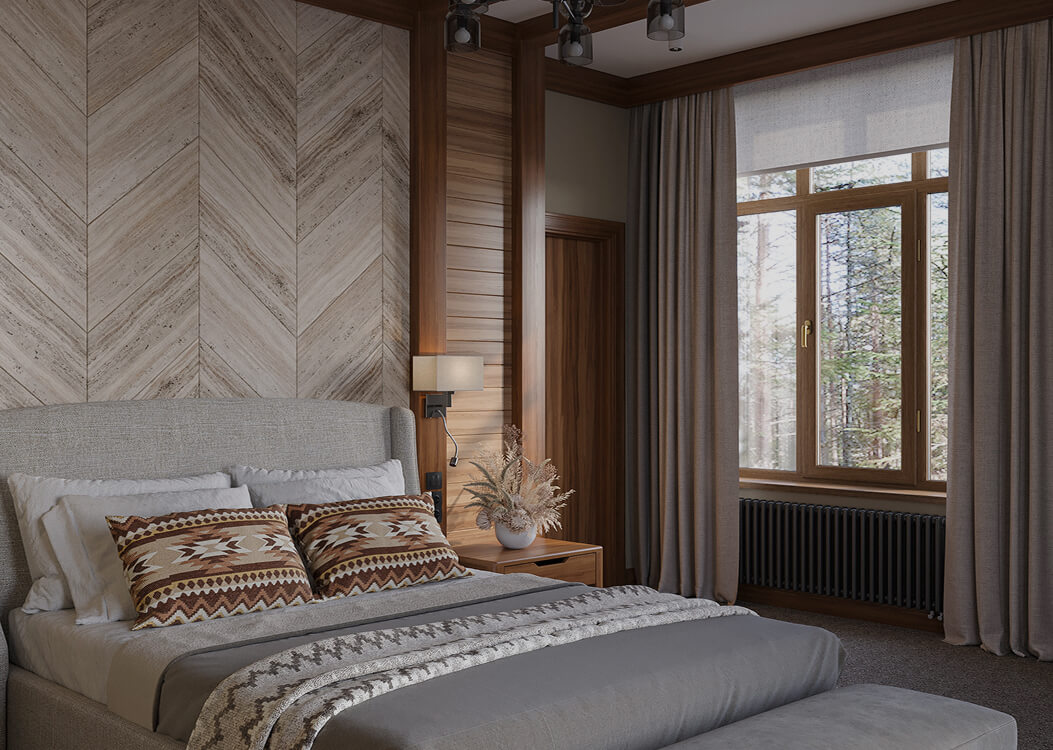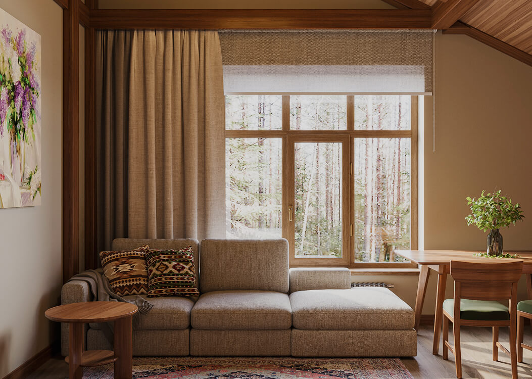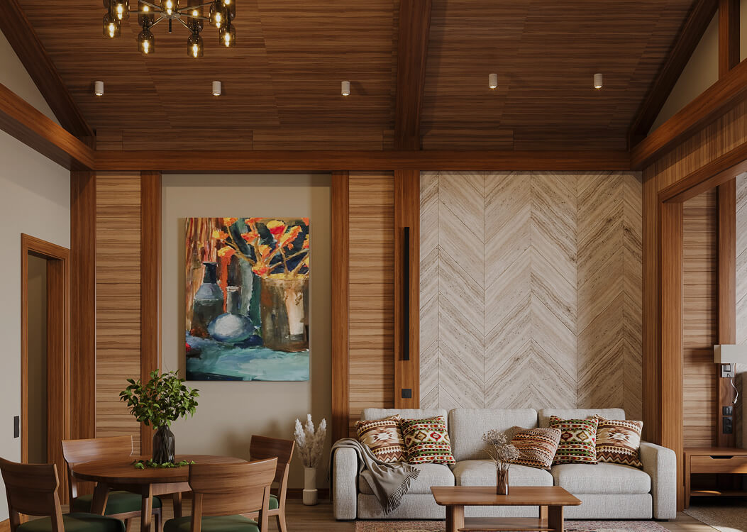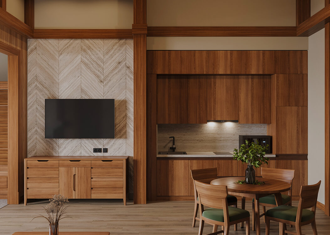 Интерьеры созданы в гамме натуральных природных материалов: дерева и камня